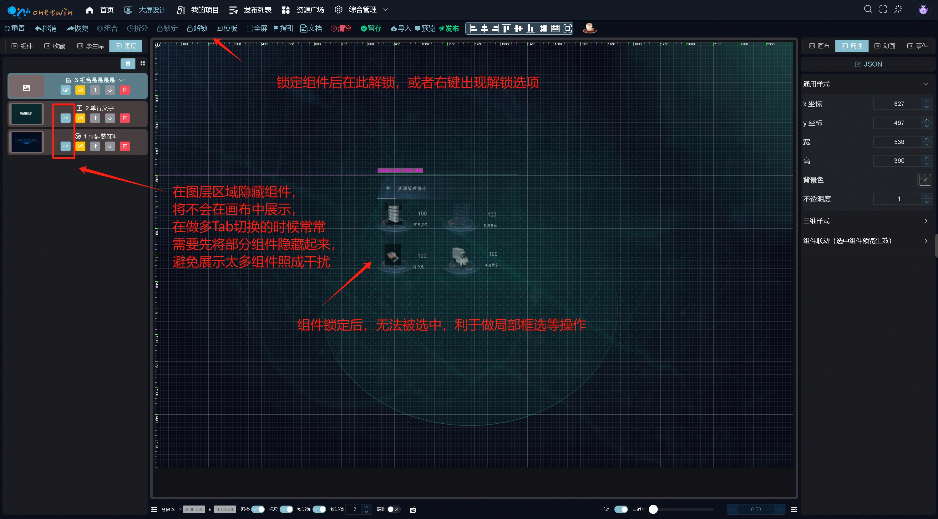 - 锁定组件还会展示在画布中,但是无法框选也无法操作