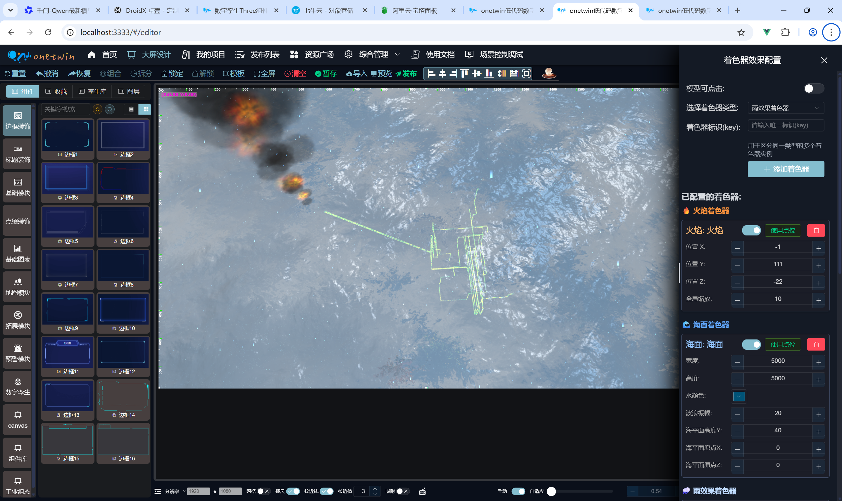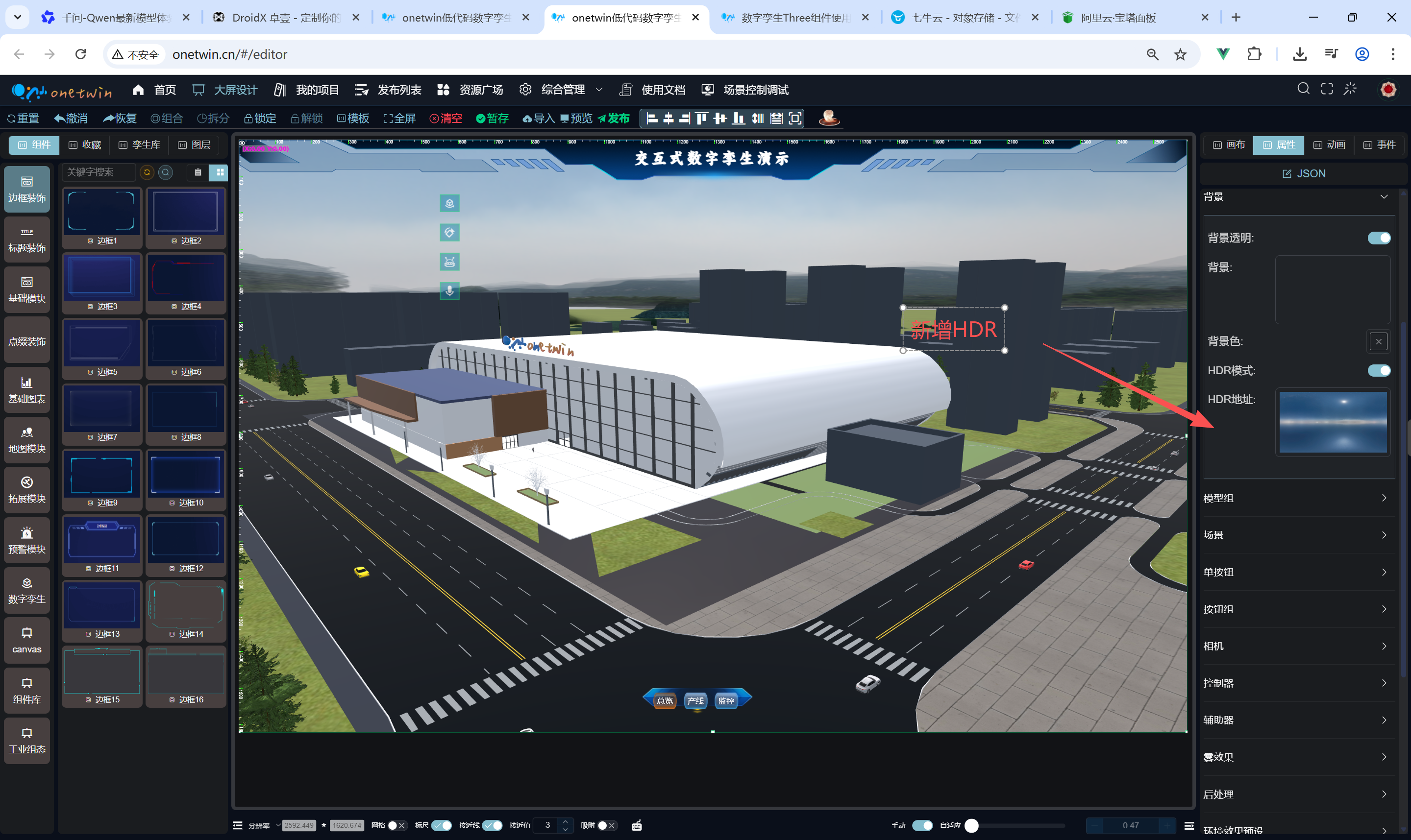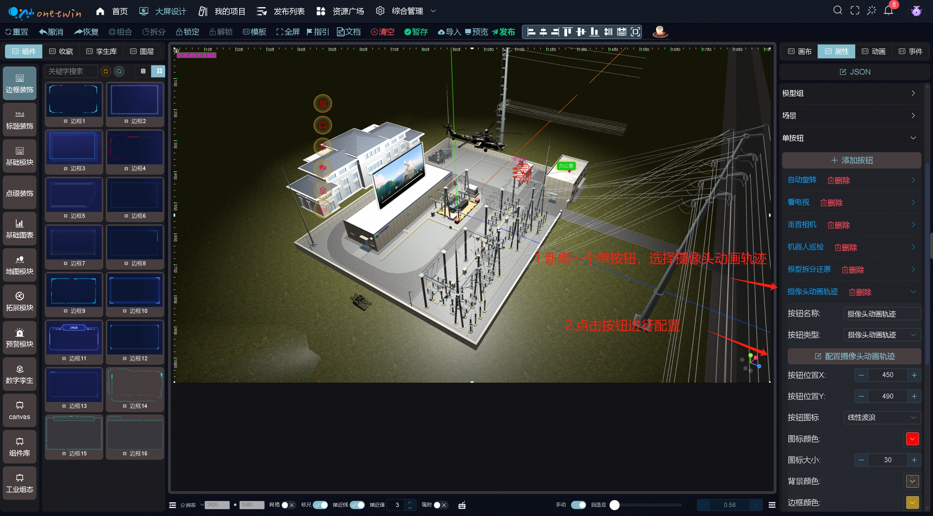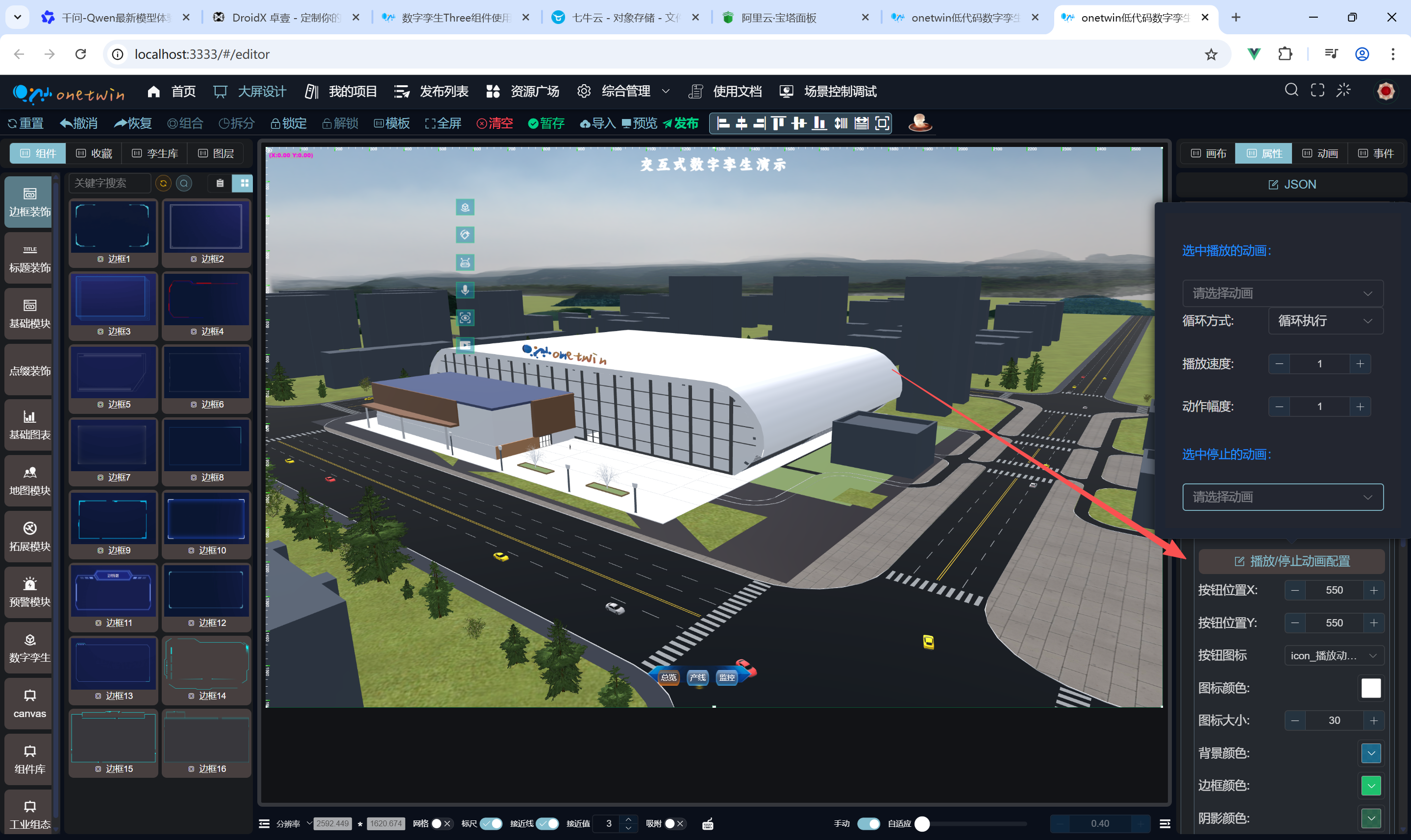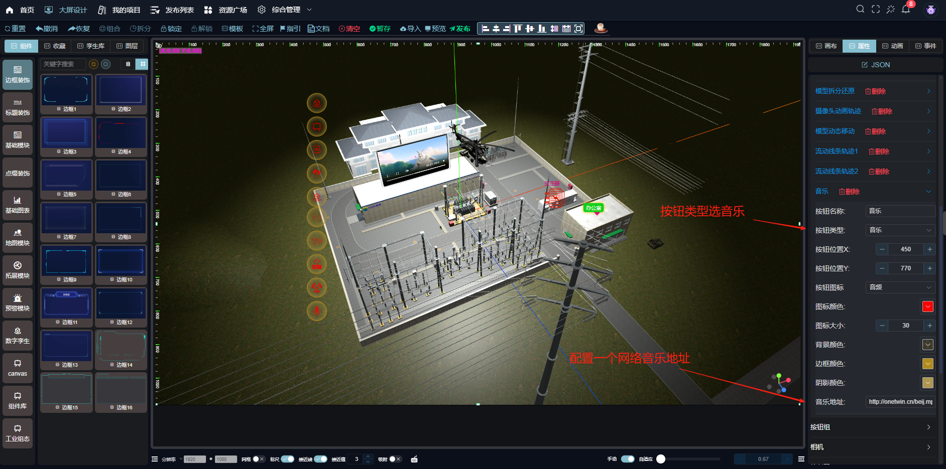 - 如:孪生交互需要点击点位展示摄像头监控,则拖出iframe组件,链入监控地址,添加到孪生库,下一个教程二维孪生交互选中摄像头组件即可达到效果