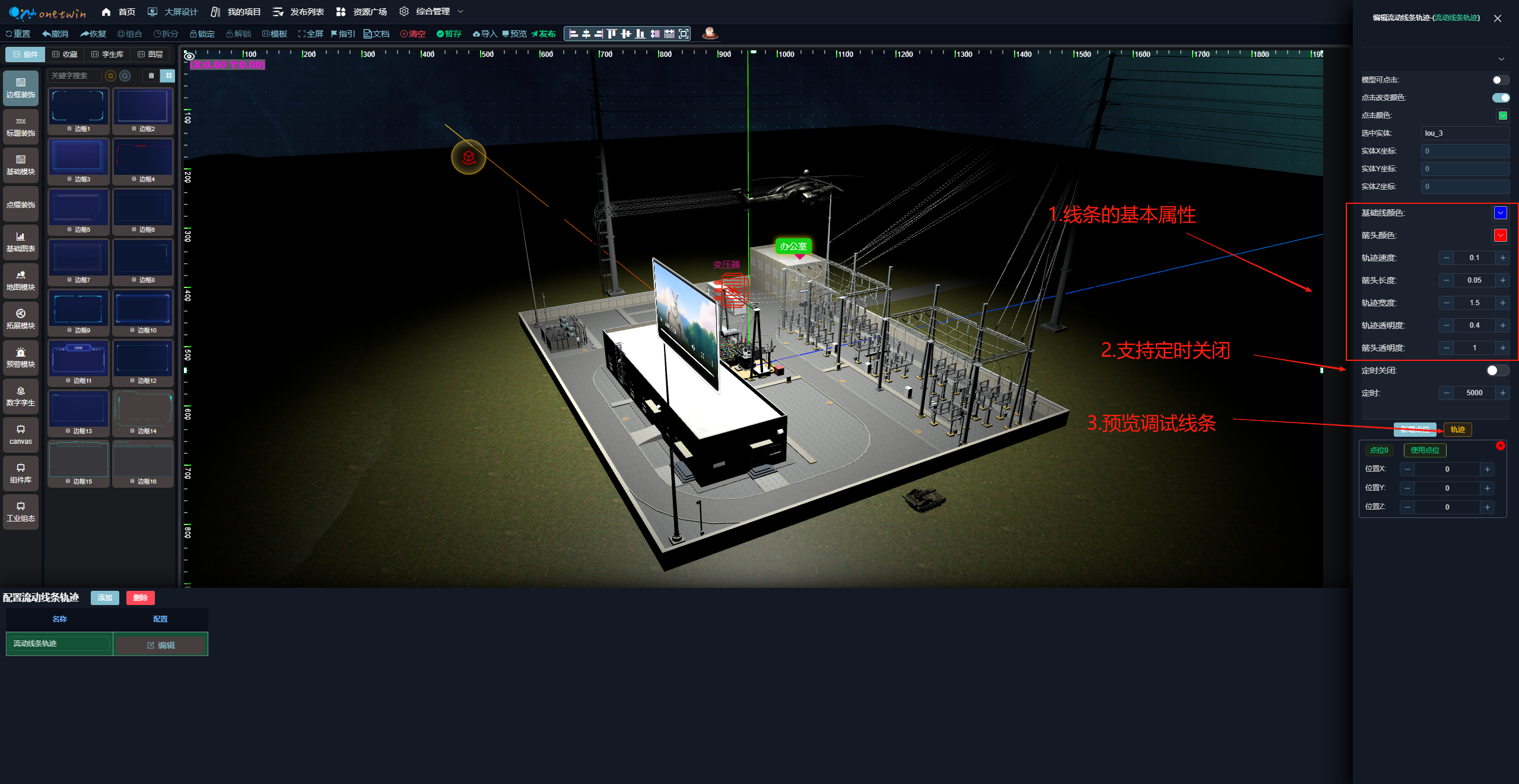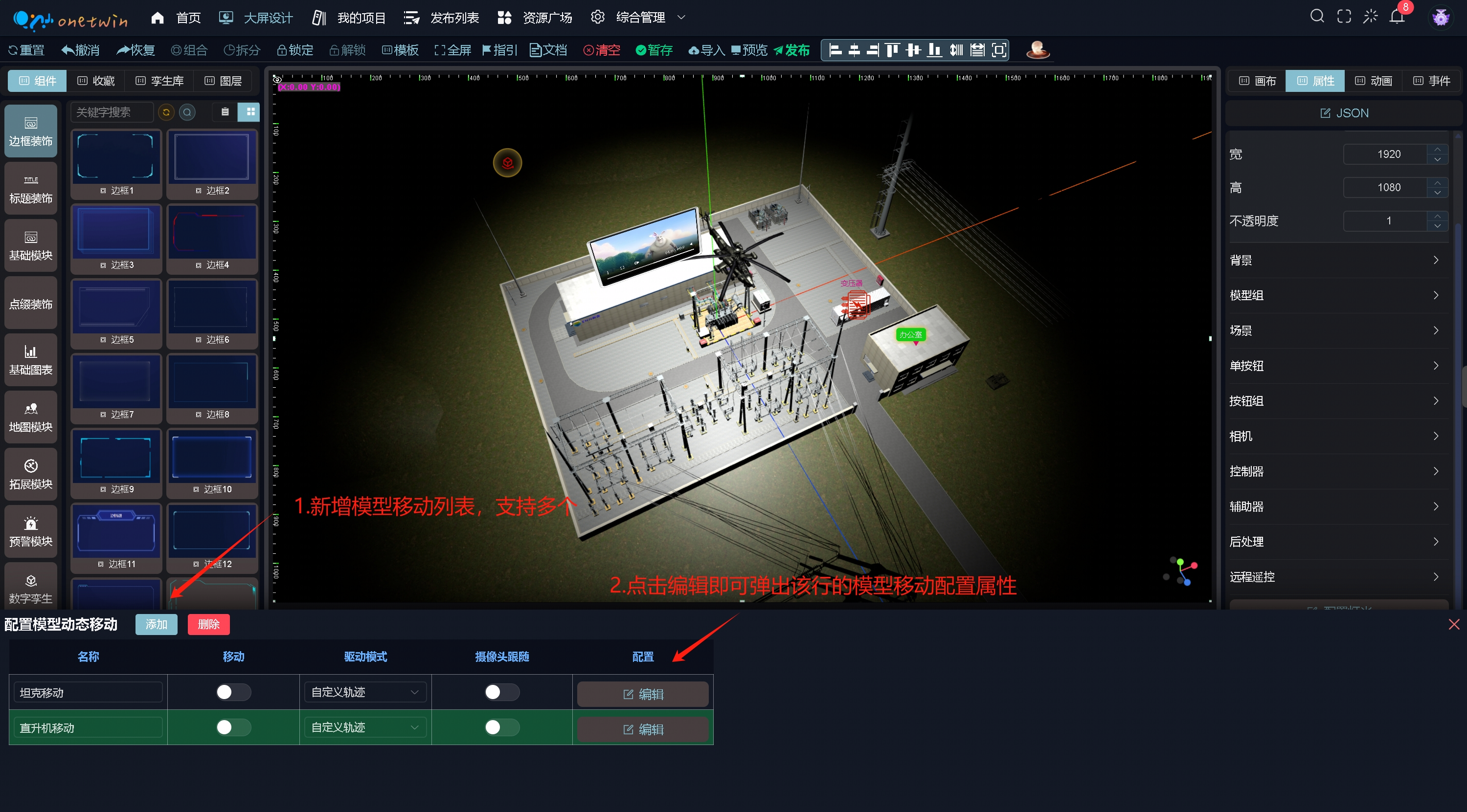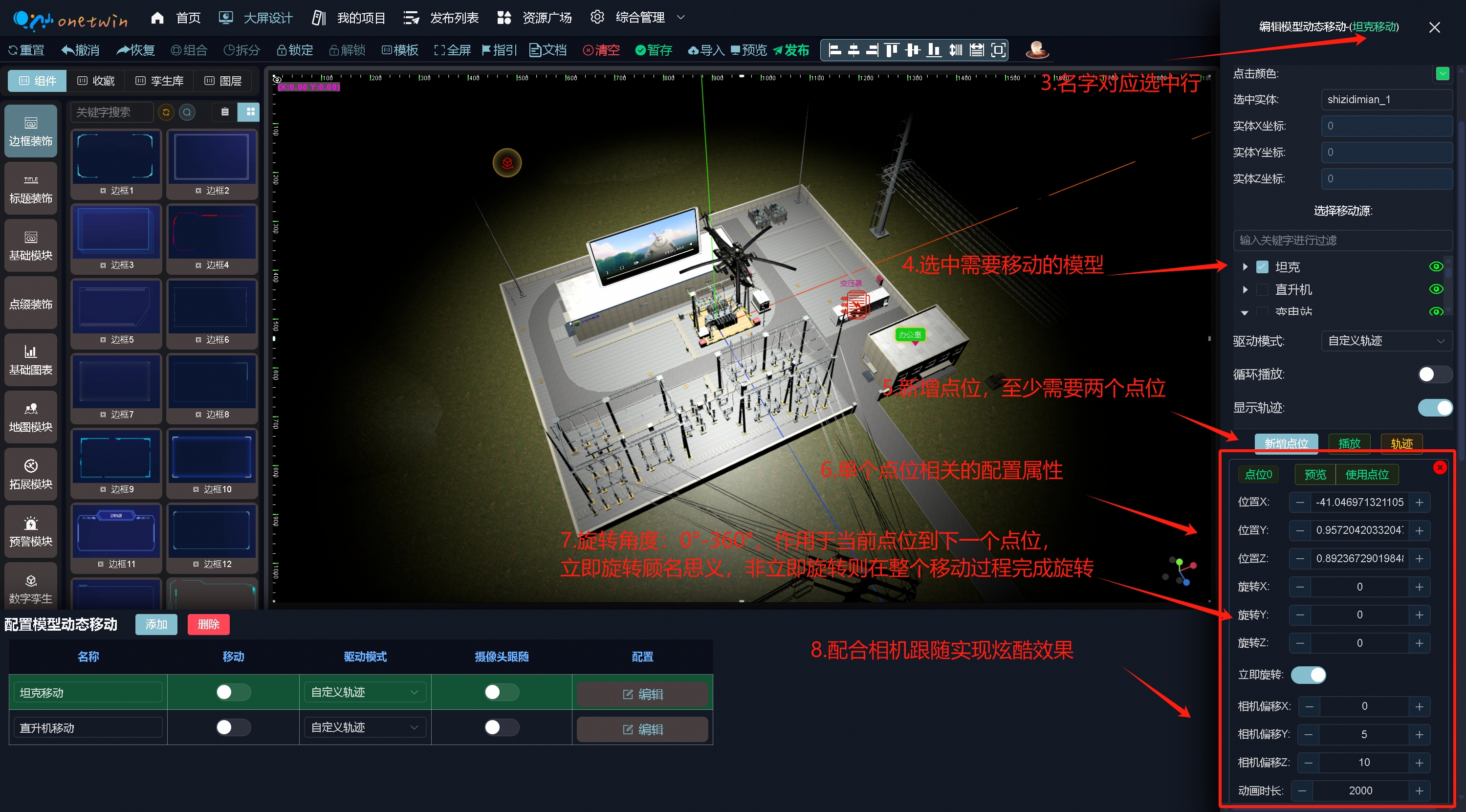 - 功能介绍:模型动态移动是支持选中模型按配置的固定路线移动,移动过程中支持摄像头跟随、模型旋转、路径轨迹等,适用于场景中自动巡检、模拟导航