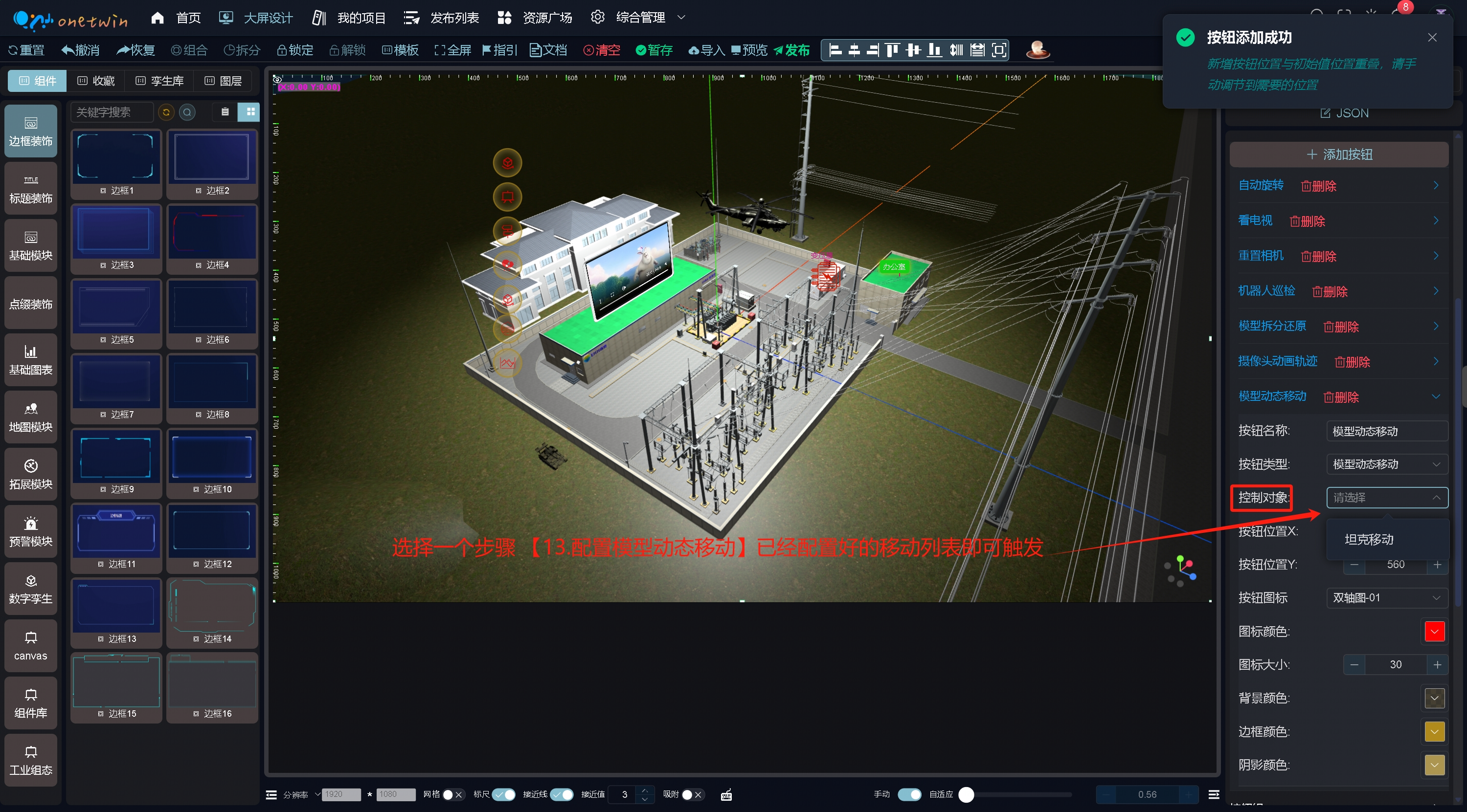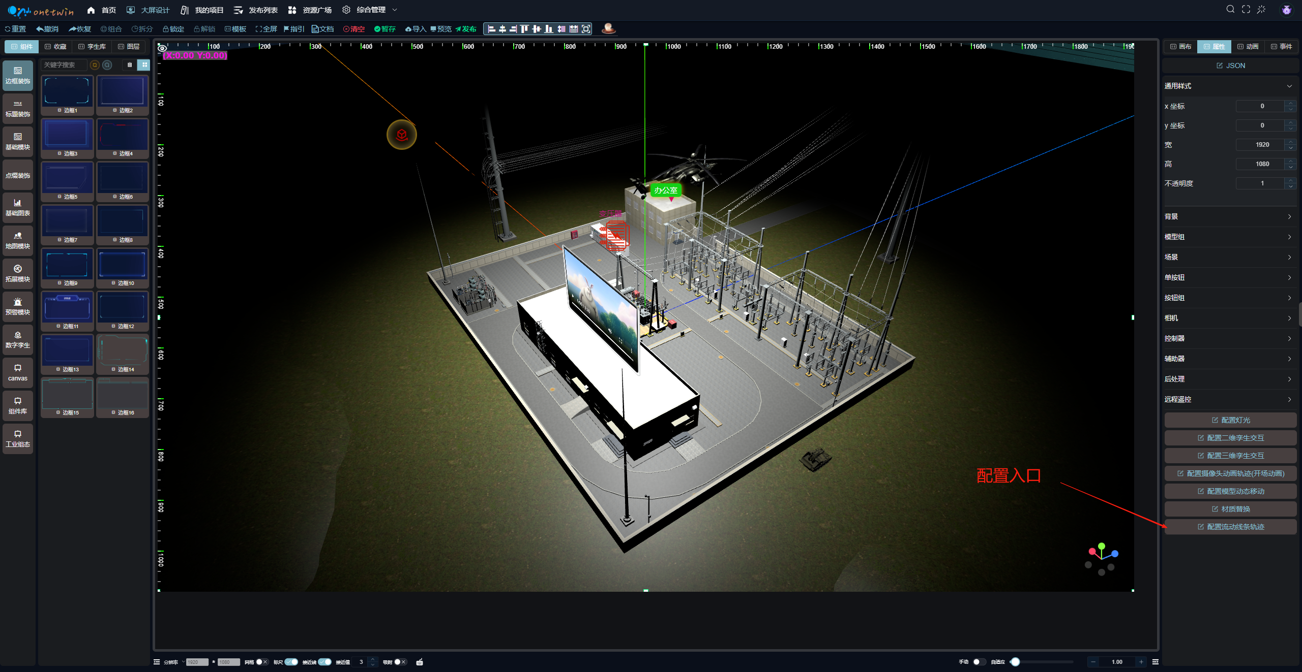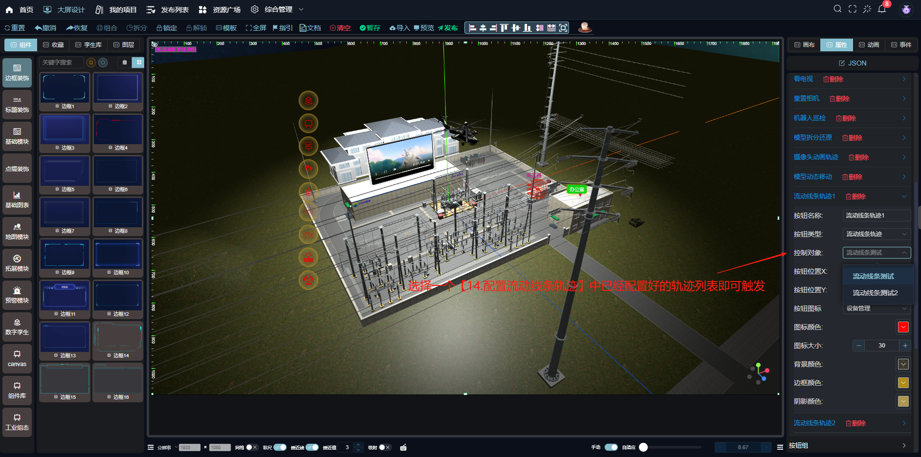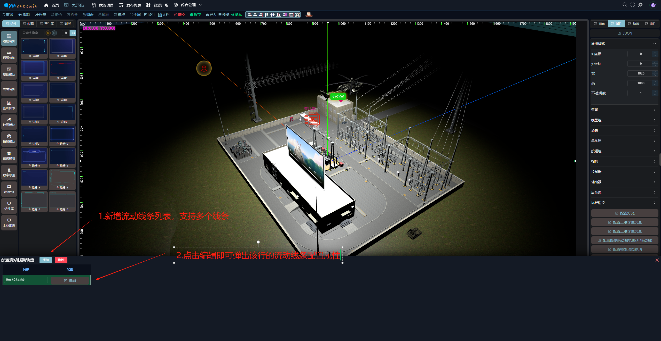 - 功能介绍:模型动态移动是支持选中模型按配置的固定路线移动,移动过程中支持摄像头跟随、模型旋转、路径轨迹等,适用于场景中自动巡检、模拟导航