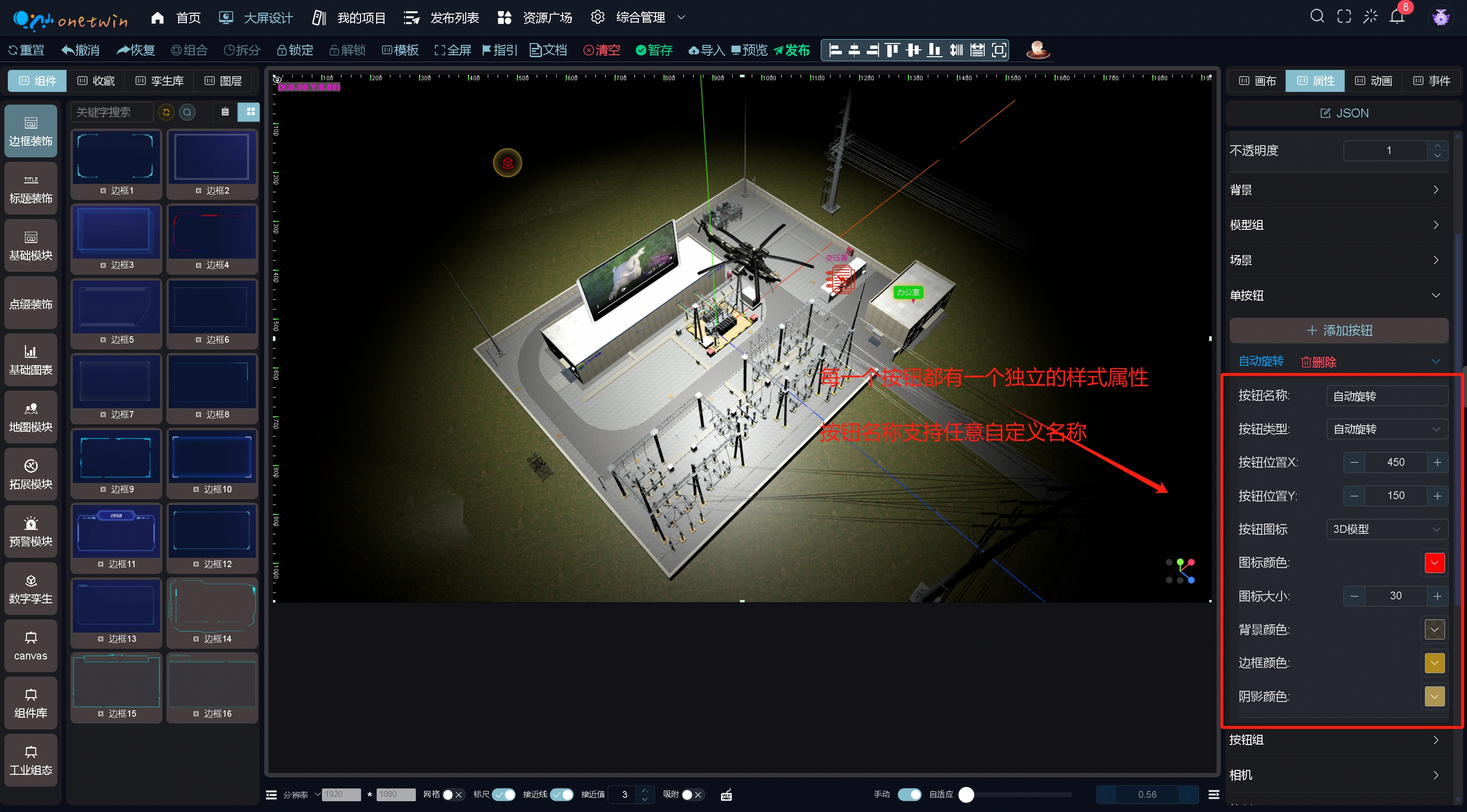 - 单按钮目前支持:切换相机、自动旋转、重置相机、机器人巡检、模型拆分与还原、摄像头动画轨迹、模型动态移动、流动线条、音乐等,持续拓展中...
