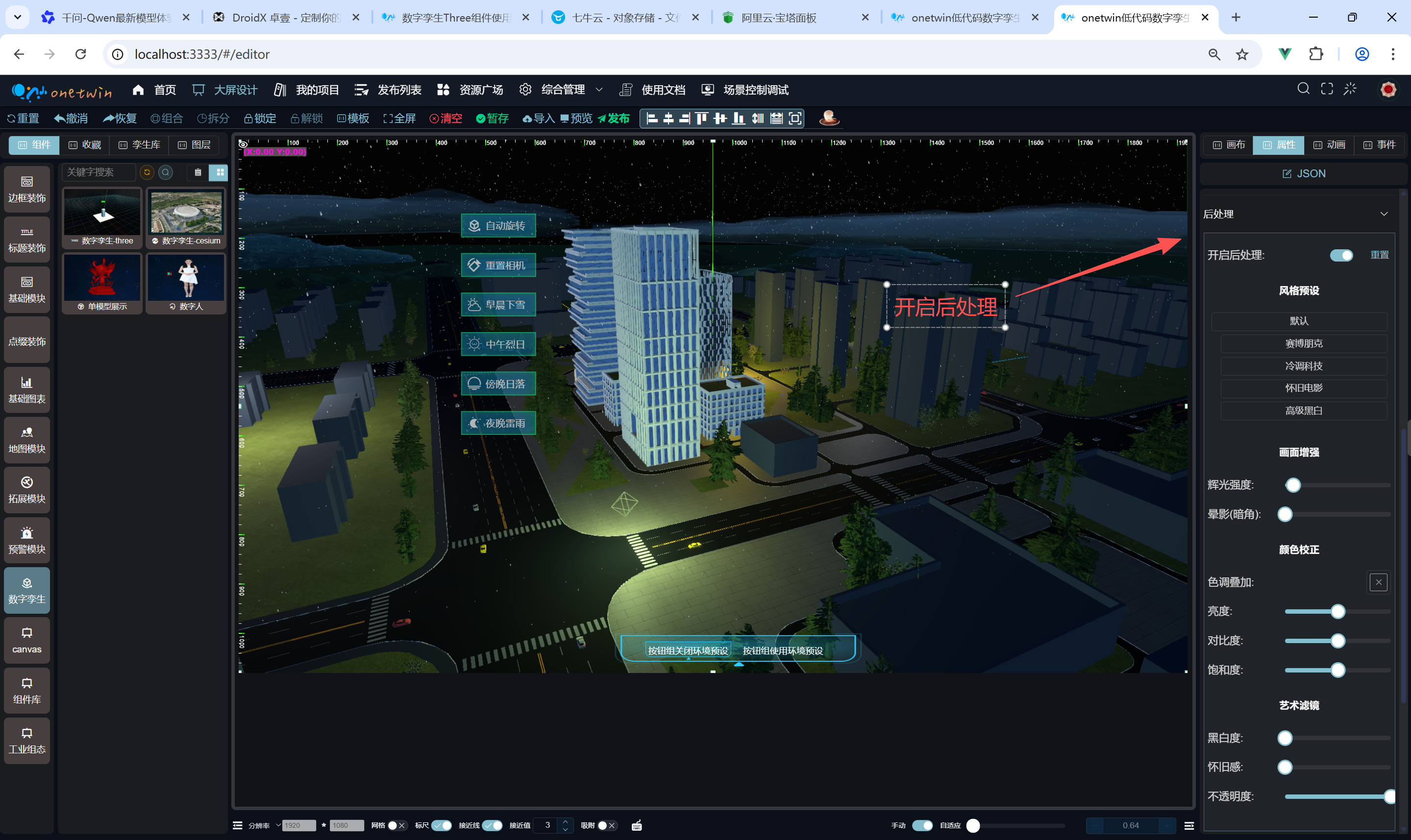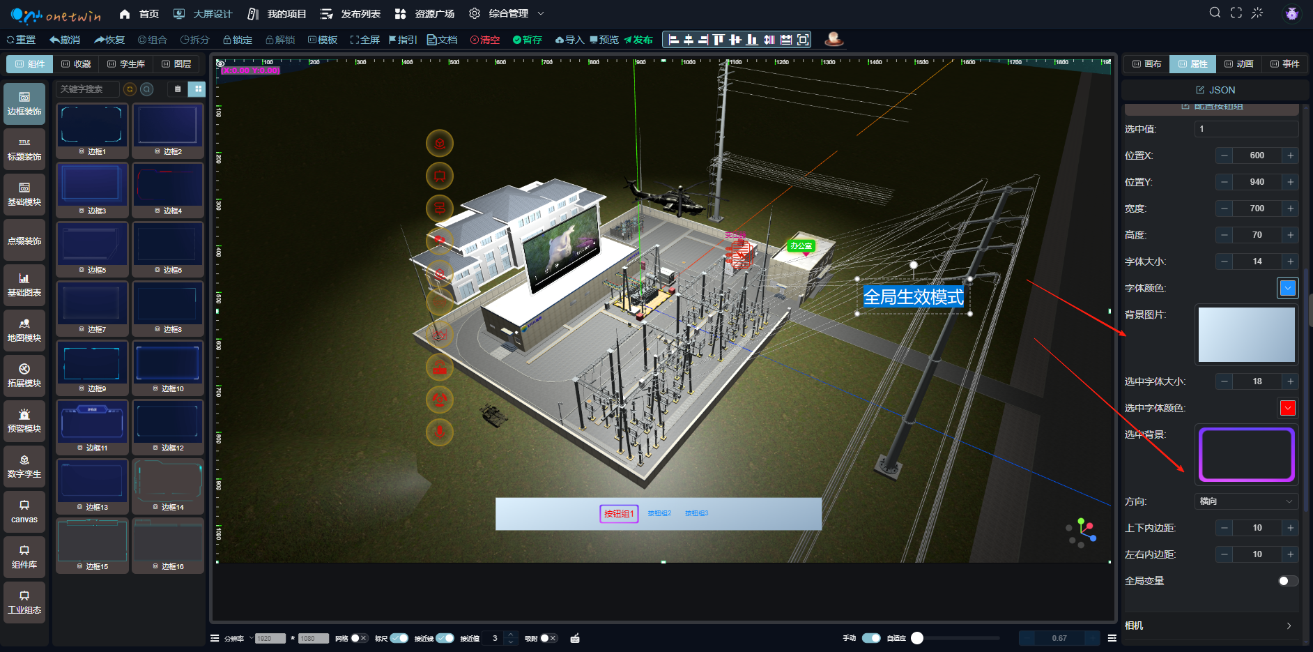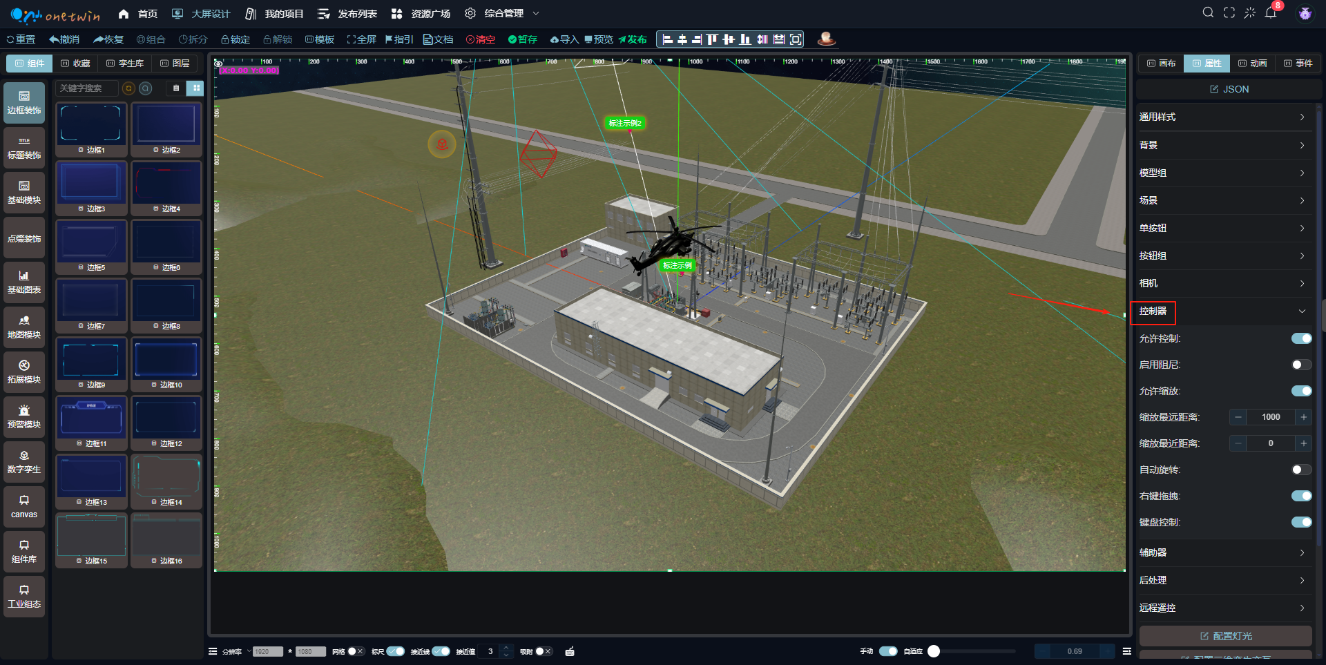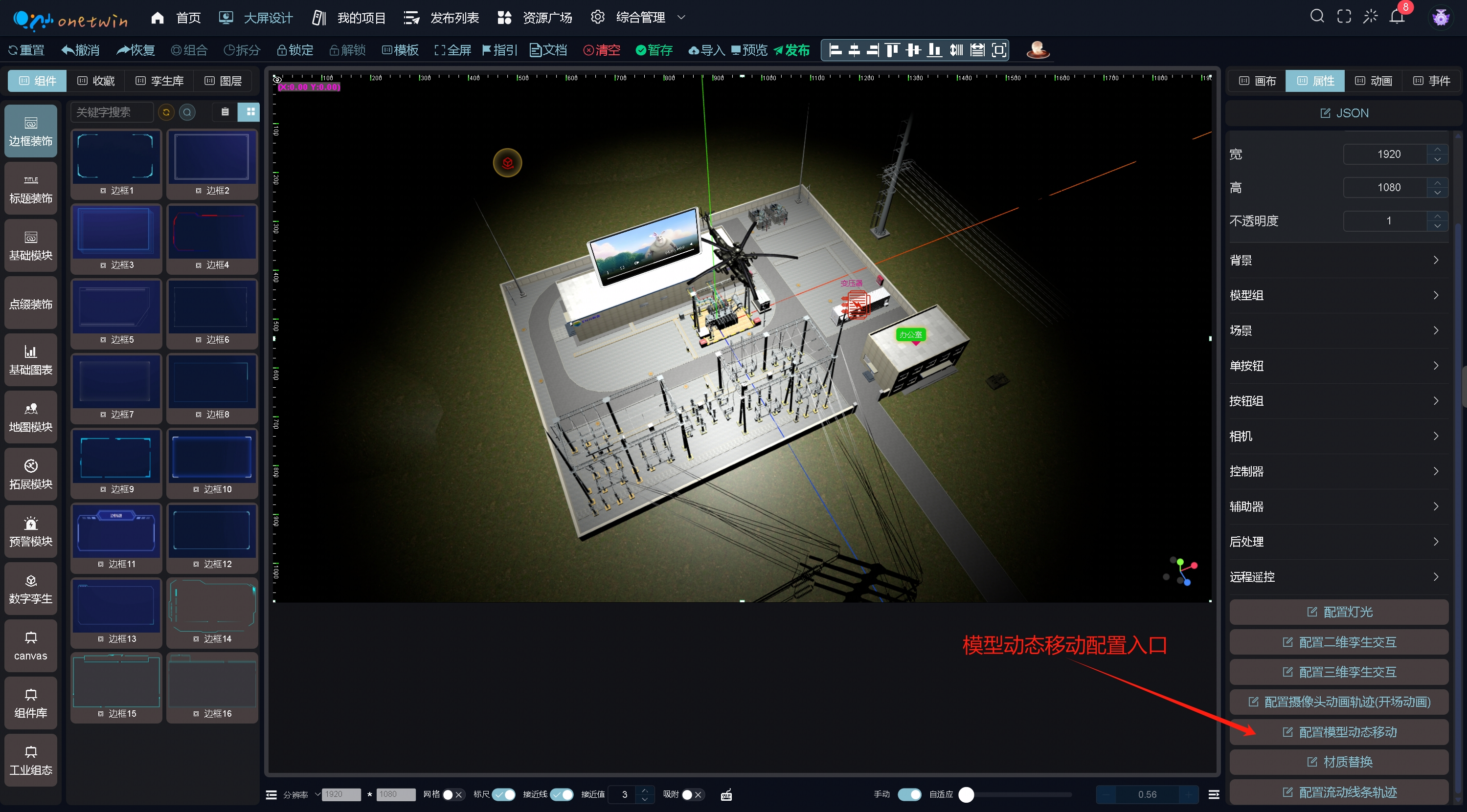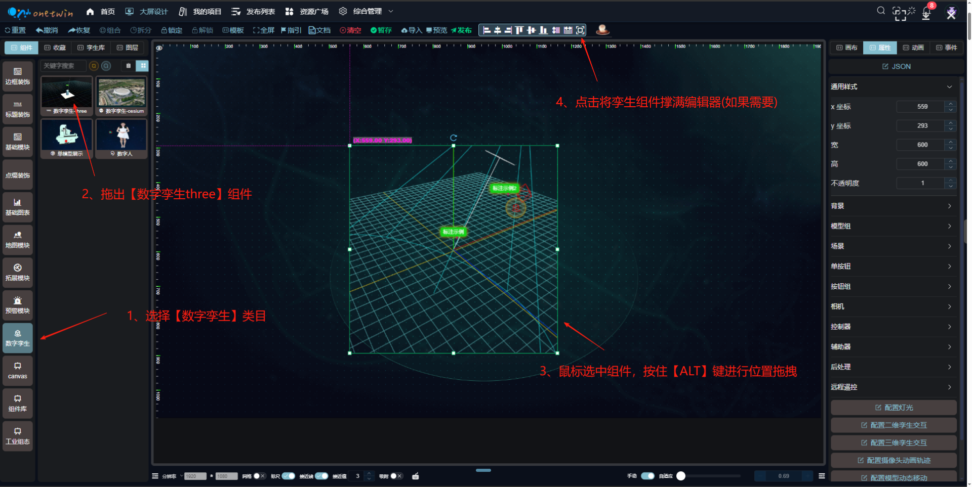 - 必须按住 【Alt】 键才能对组件进行缩放和位移,否则鼠标的移动会触发孪生组件的相机视角变化,一般建议点击顶部快捷键 【全屏铺满】