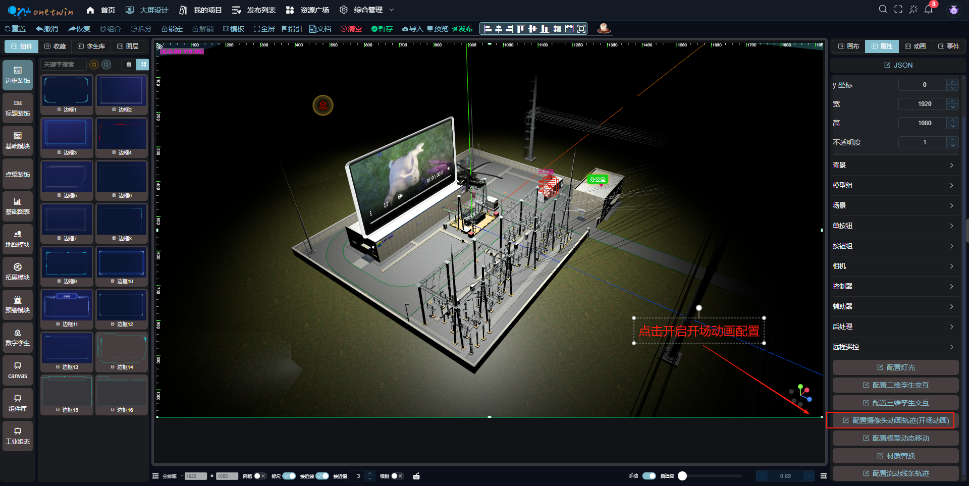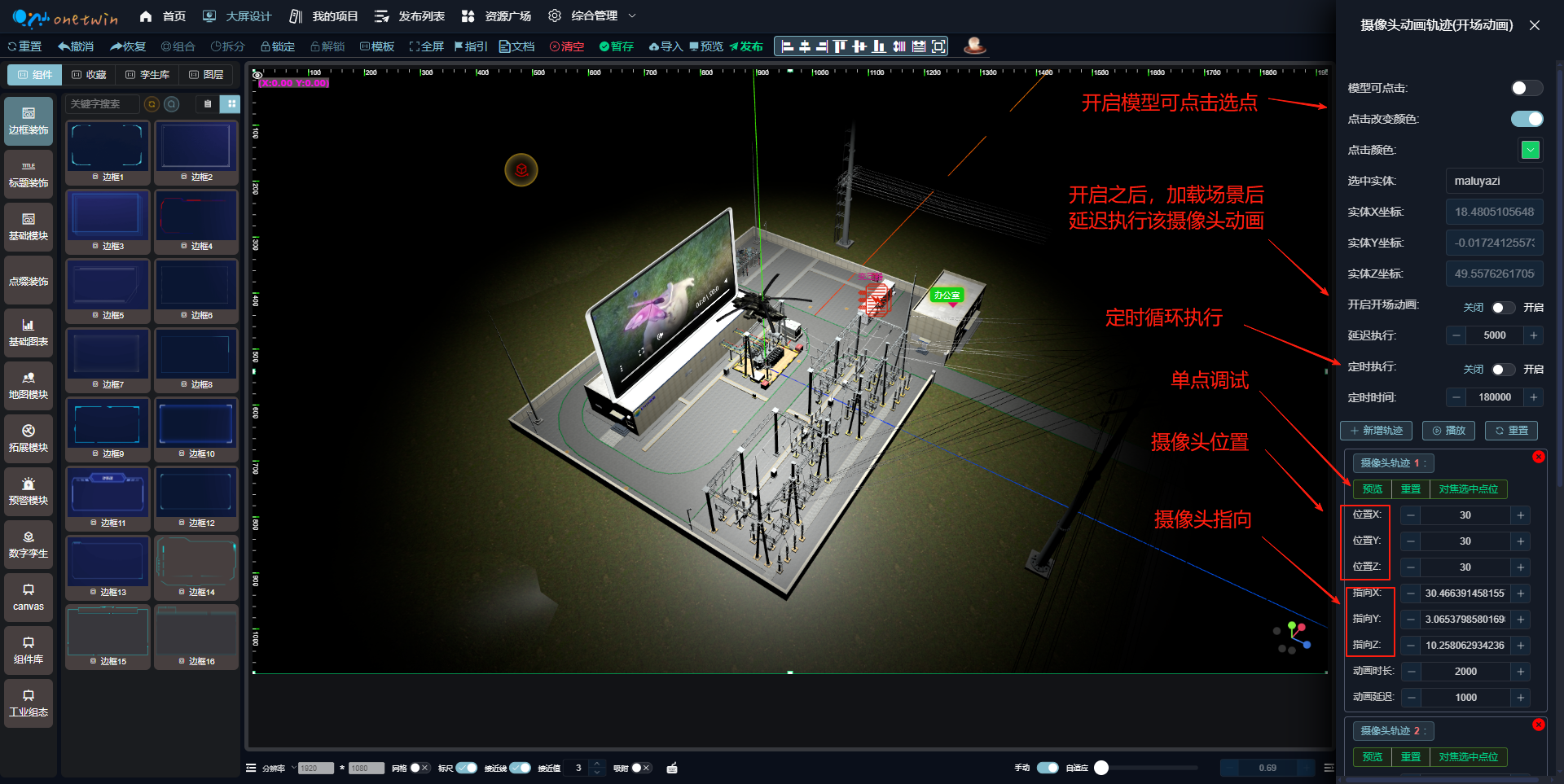 - 功能介绍:摄像头动画轨迹是配置摄像头按固定轨迹定时切换,摄像头焦点也支持配置,切换过程带动画效果(类似于电影场景动态切换)