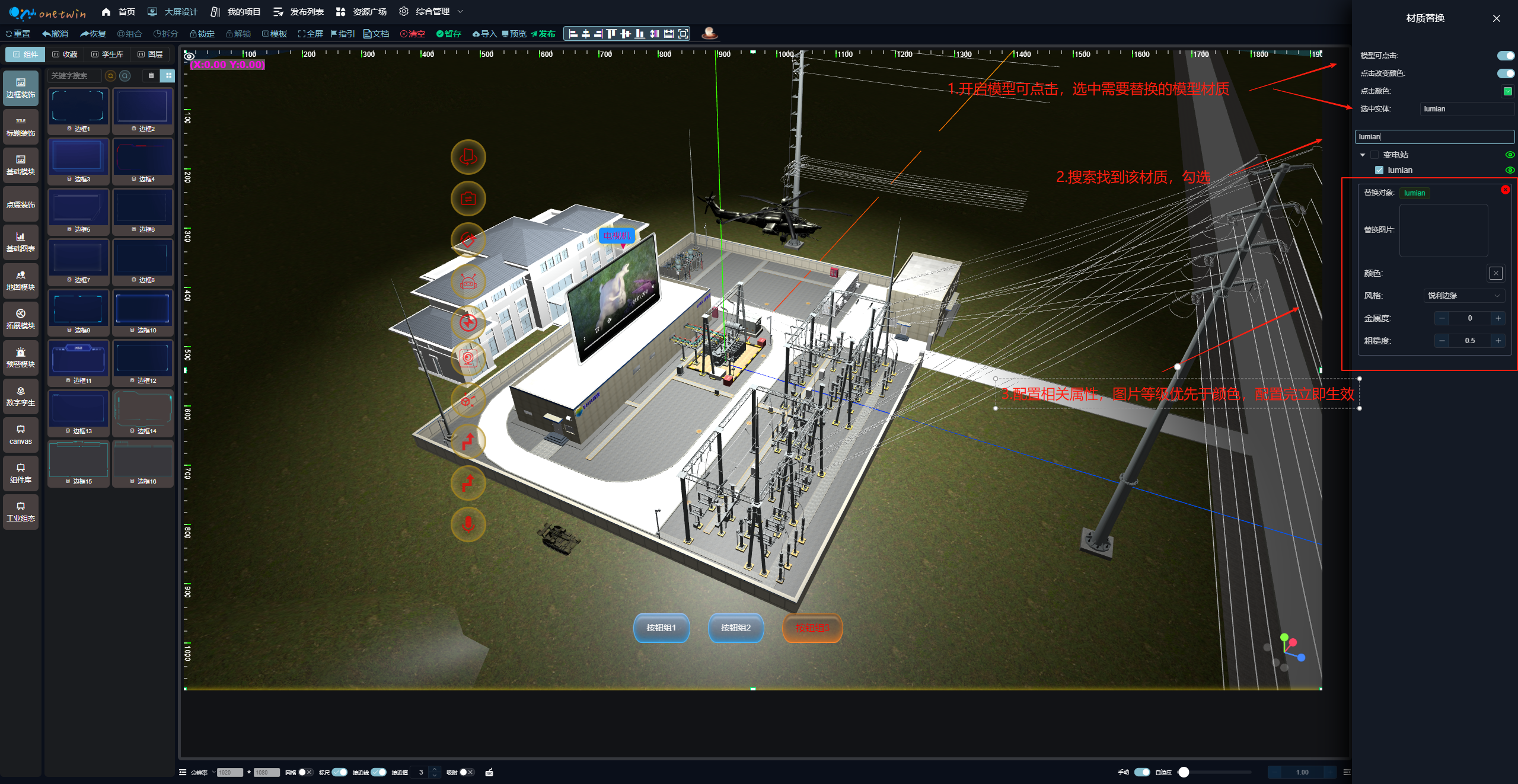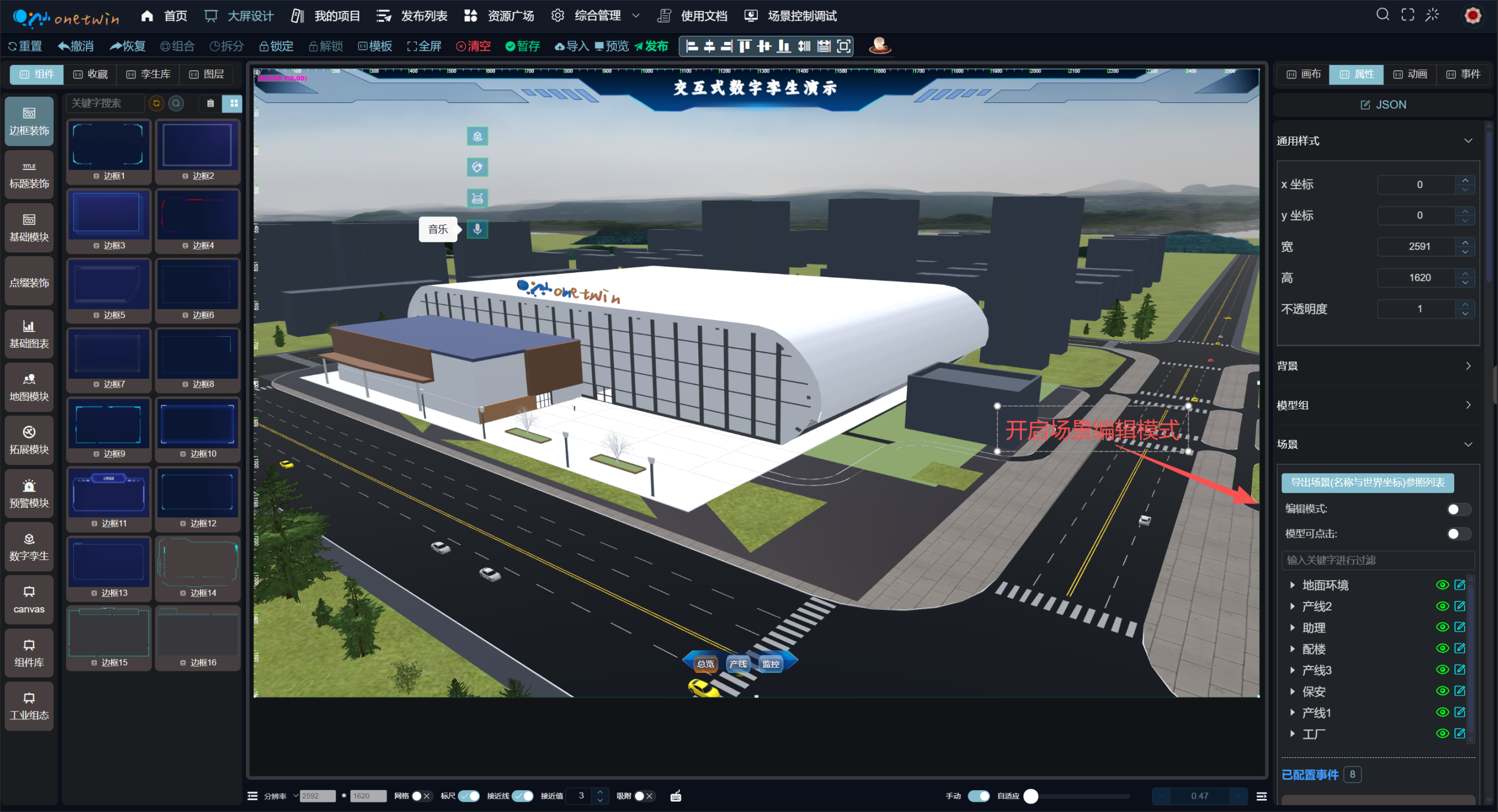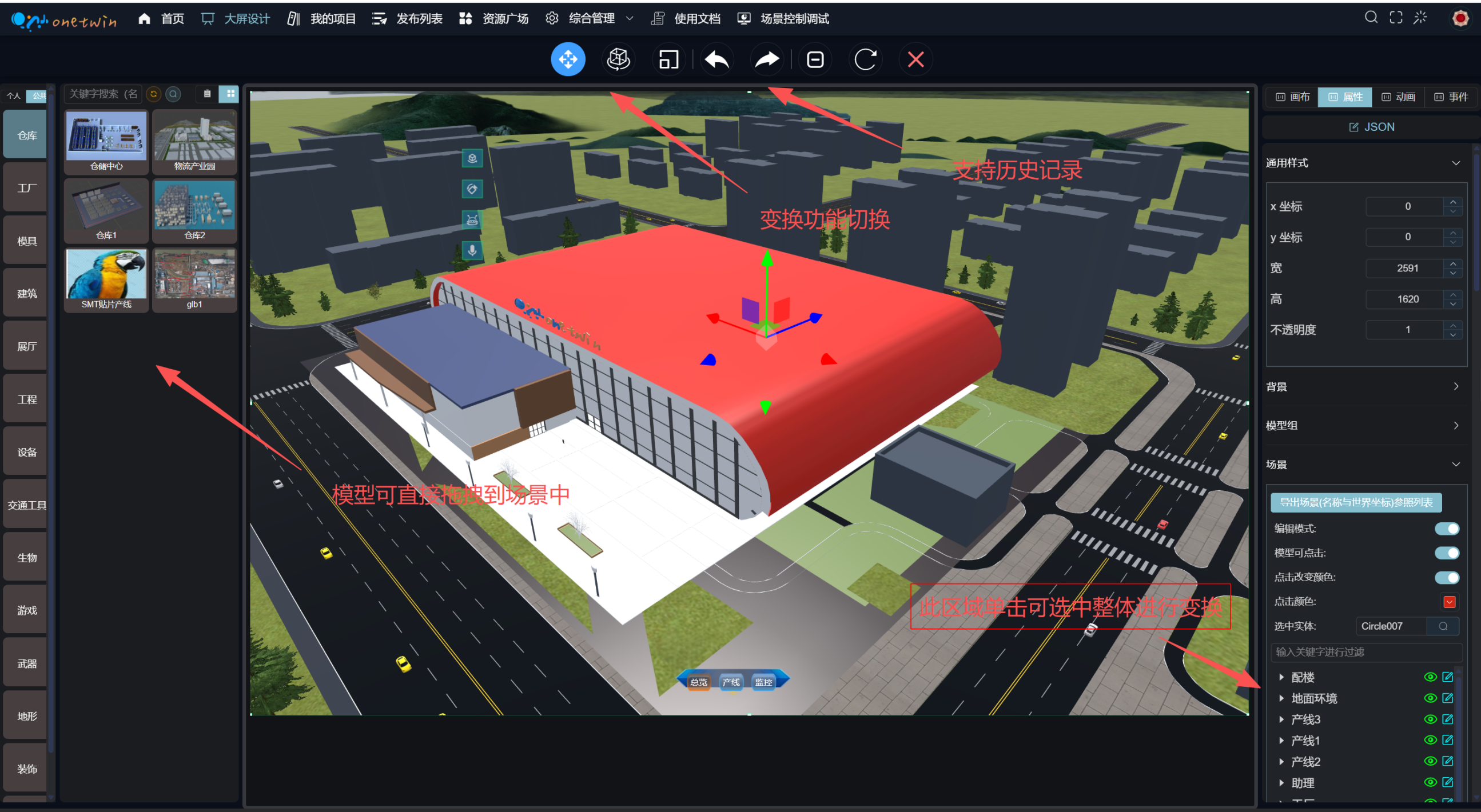 “模型编辑器”是数字孪生系统的核心交互工具,支持用户在三维场景中直观地进行模型选择、变换、拆分与还原等操作。通过顶部快捷按钮进入编辑模式后,可对场景中的任意模型执行精确调整,极大提升设计效率与可视化表达能力。