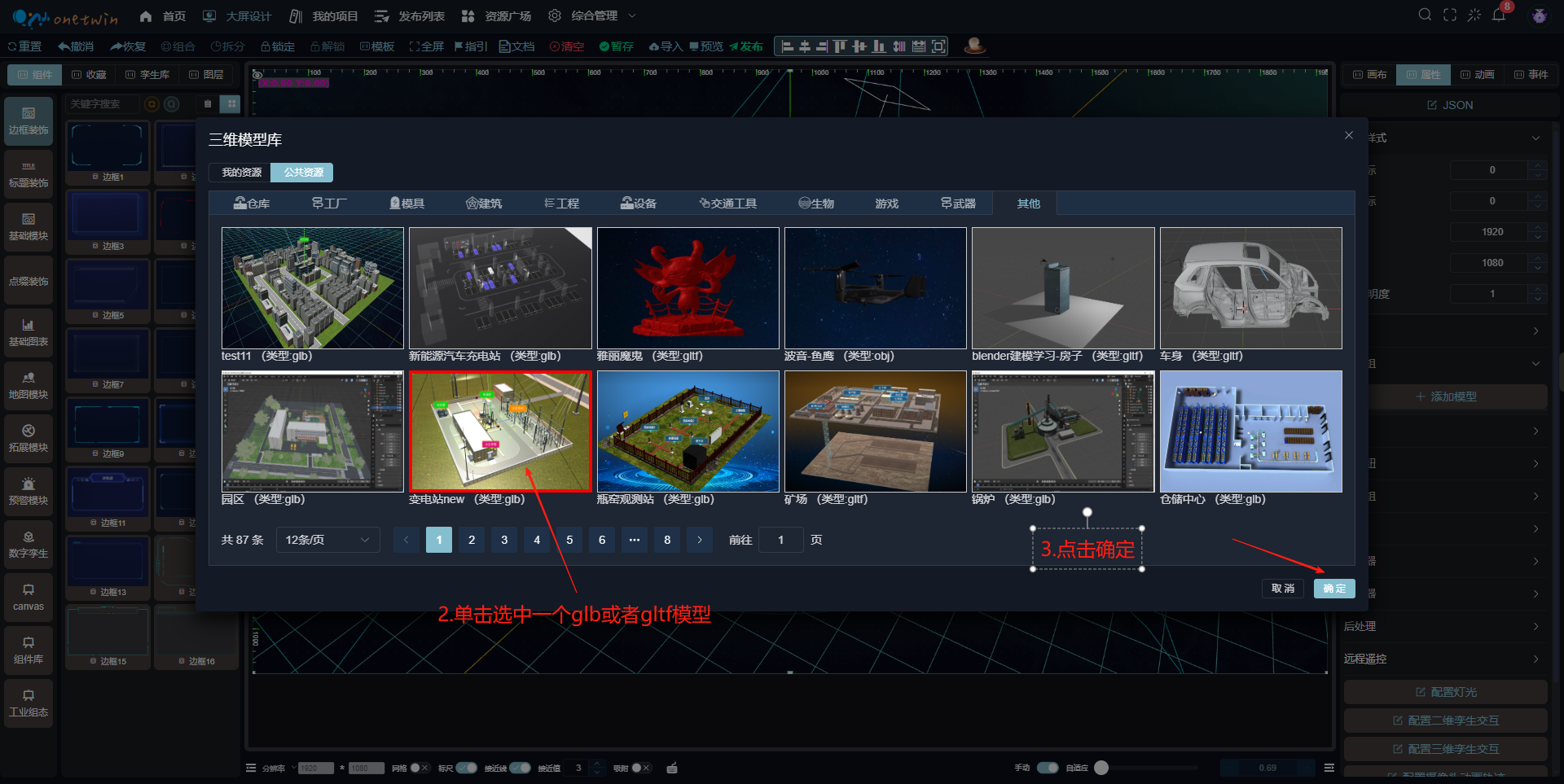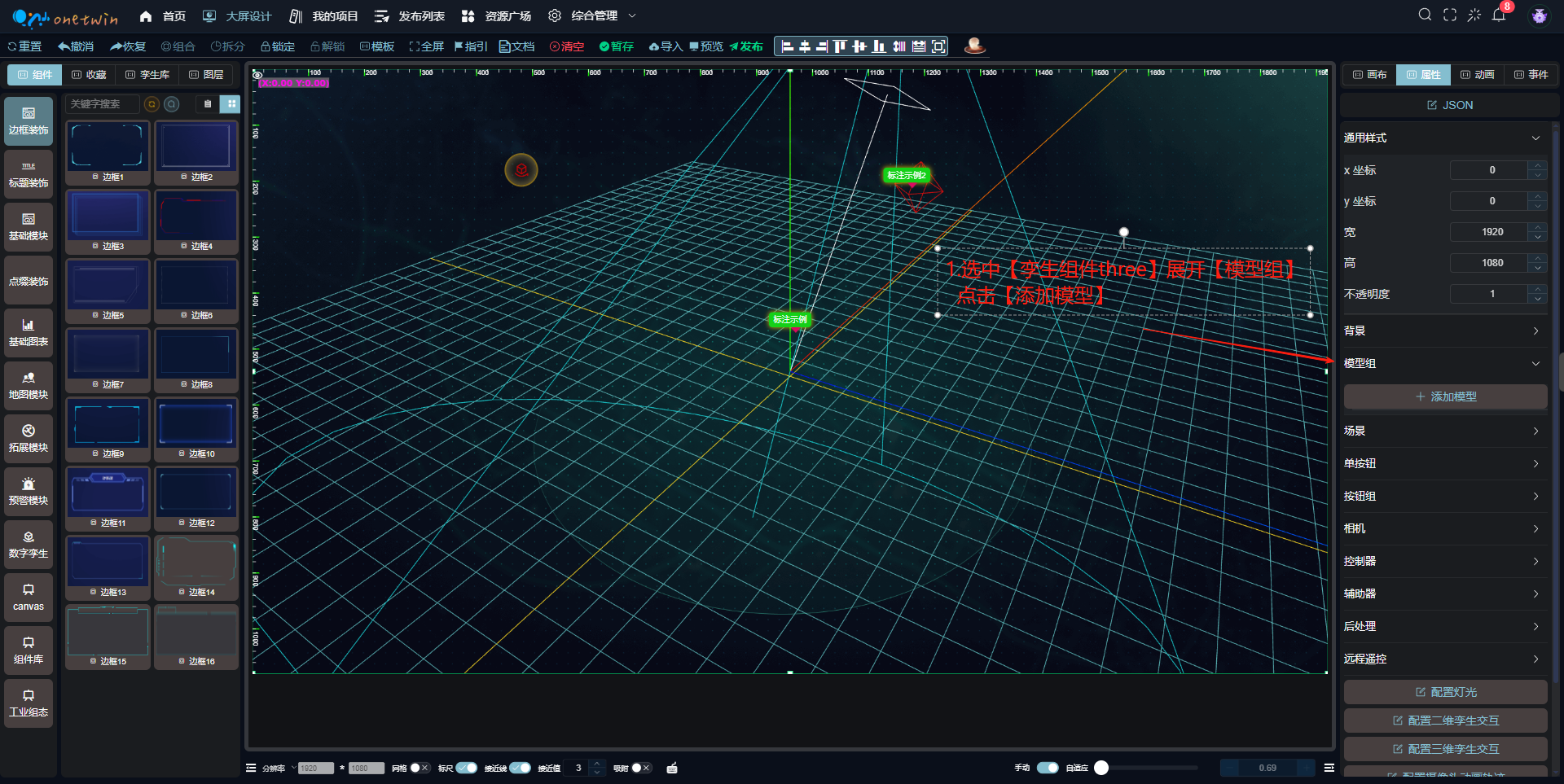 - 2.右侧属性面板中【模型组】 点添加,选中模型,点击【确定】,仅支持 glb/gltf两种模型格式