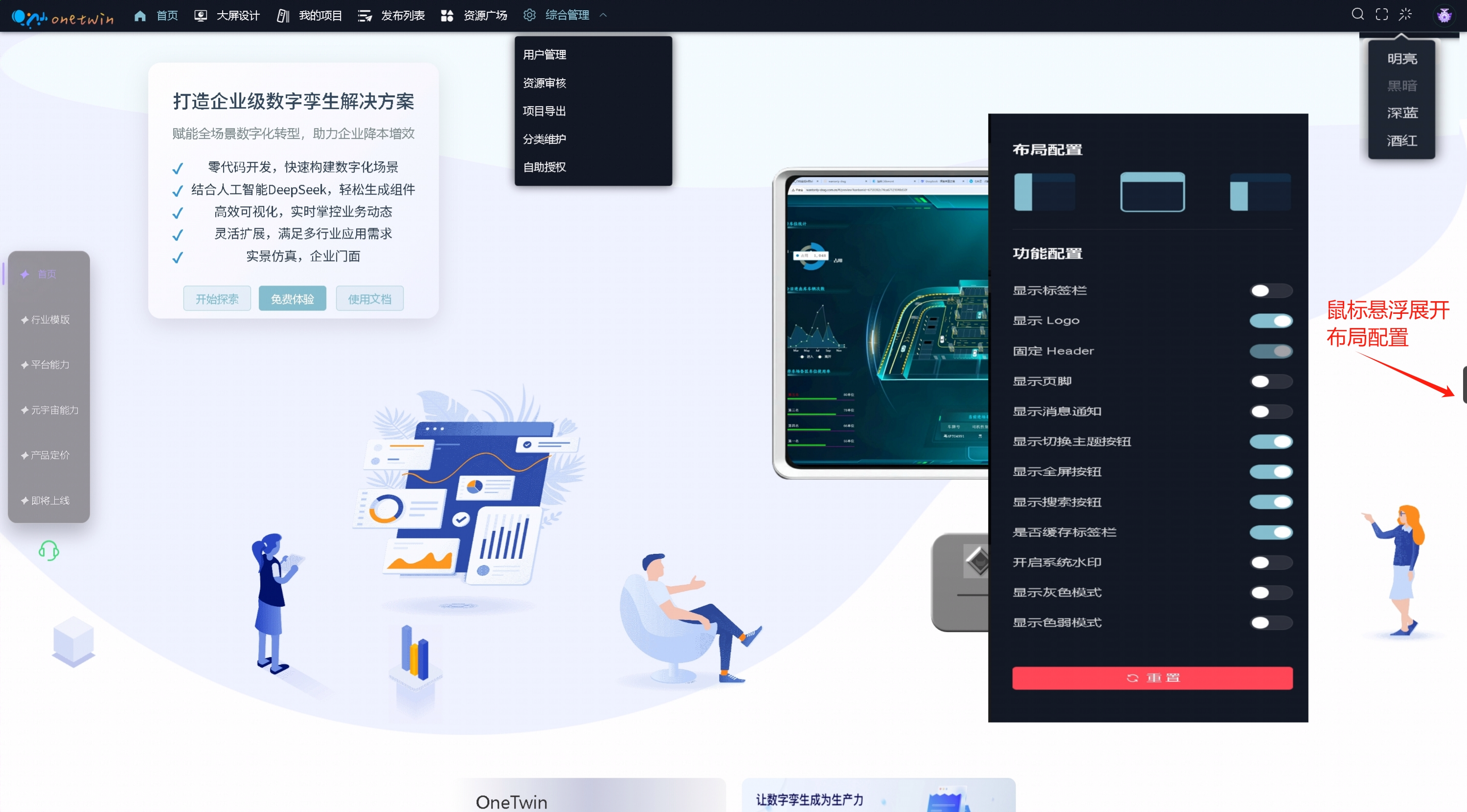 - 提供四种主题模式,入口:右上角:主题切换。