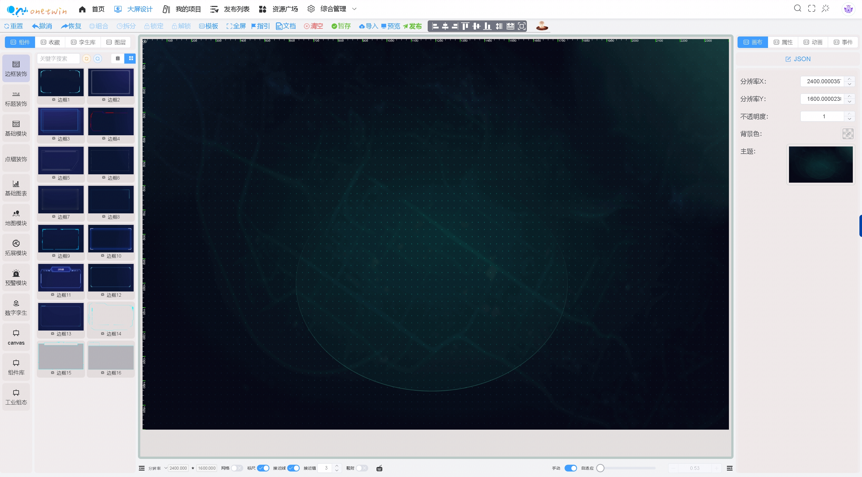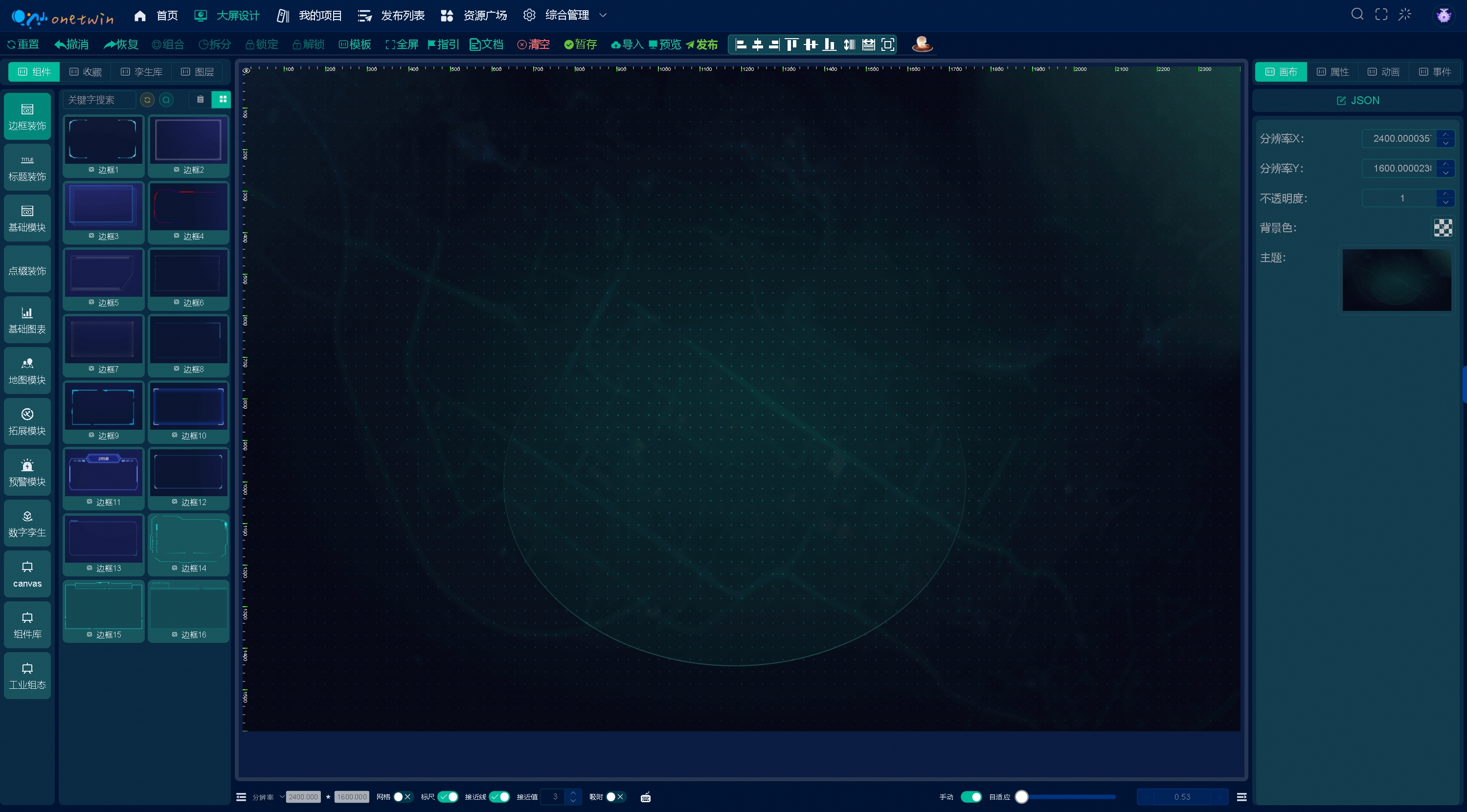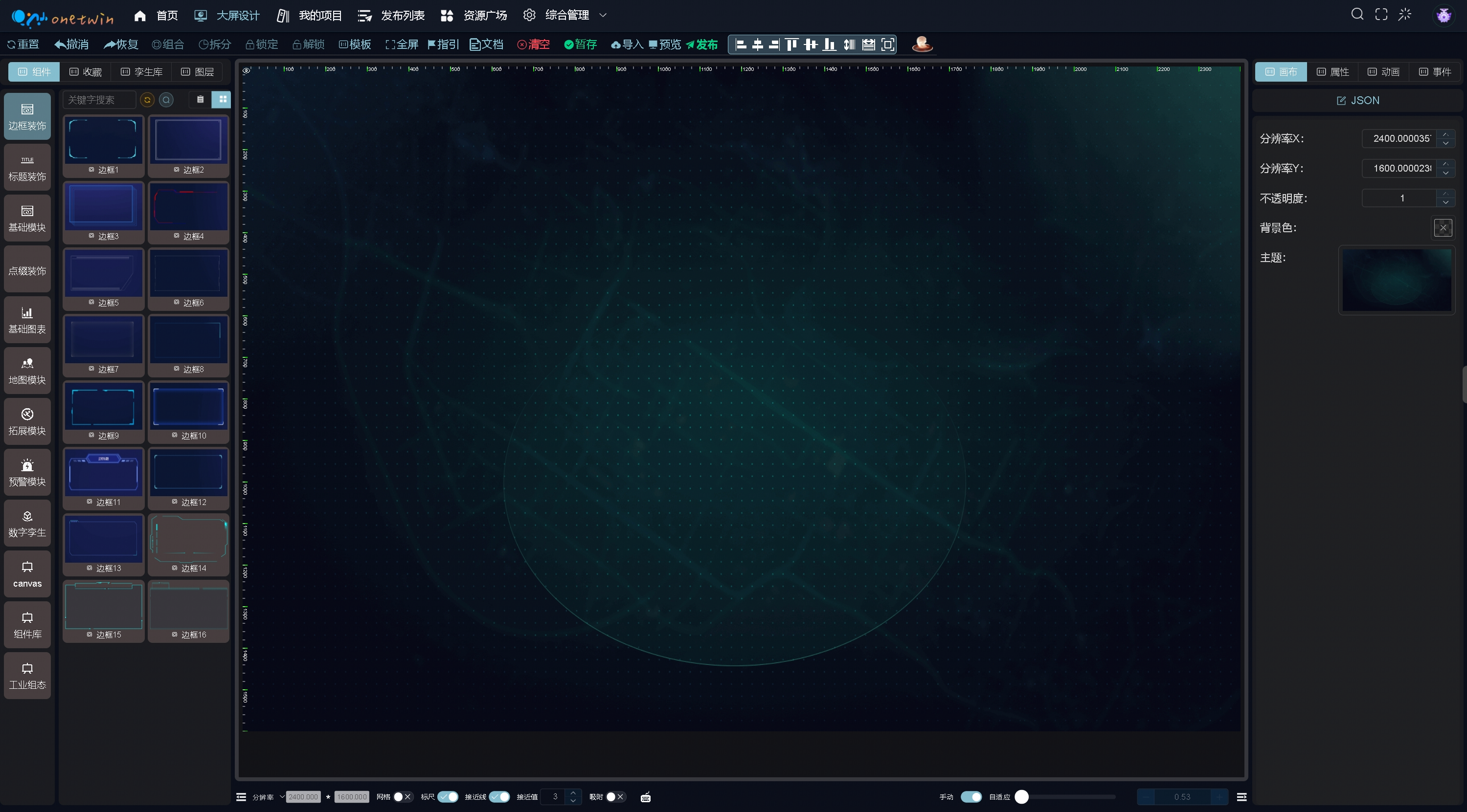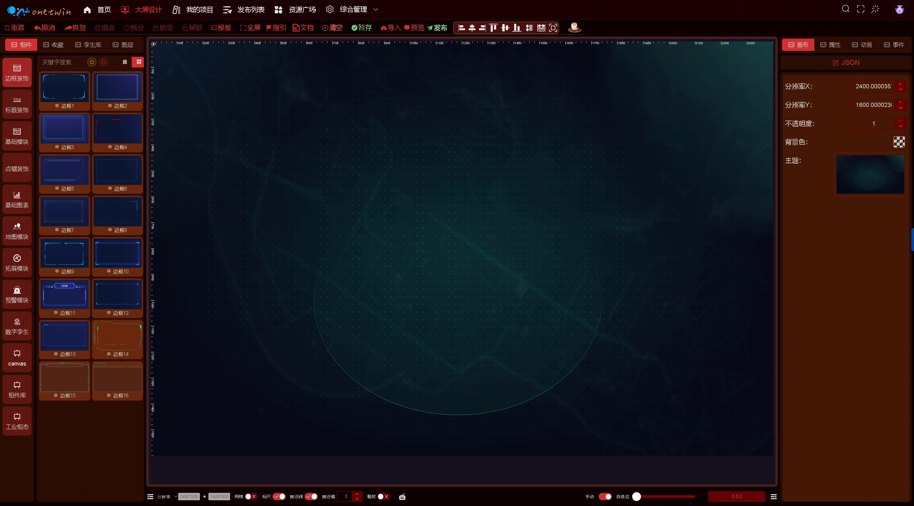 - 中间是画布区,通过鼠标将左侧组件拖入中间画布中组合成需要的看板。